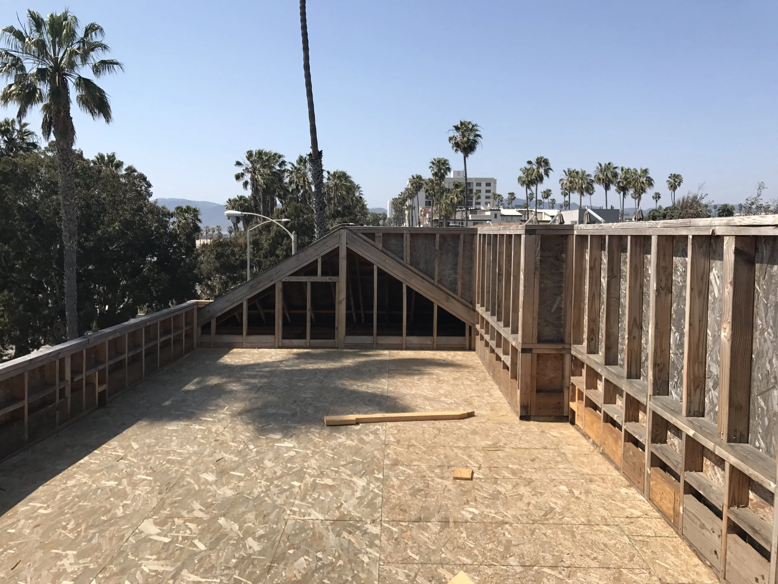 We decided on a mixture of casual and eclectic elements. Throughout the home we incorporated geometric tile, a rooftop deck with jacuzzi and bar, an outdoor pop-up TV, a swimming pool with lounging platforms, and small indoor bar with illuminated mirror backsplash.